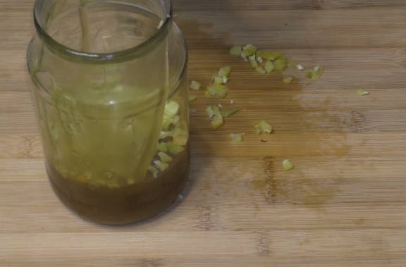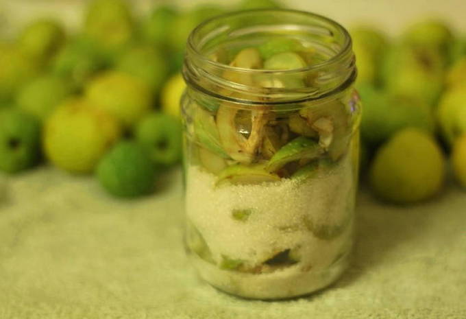 - We brengen de gehakte kweepeer over in een pot met honing en gaan verder met de bereiding van de noten.