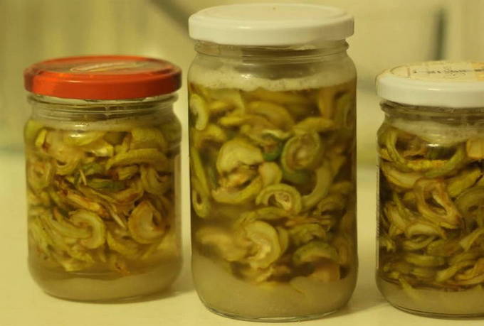 - Leg de kweepeerplakjes in lagen in een pot en giet er suiker tussen. Dus we vullen alle blikken tot de top en vertrekken voor een uur. Gedurende deze tijd zal ze het sap opstarten.