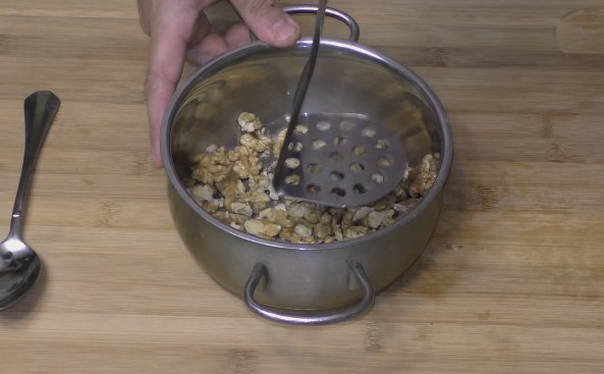 - We brengen de walnoot over in een diepe container en pletten lichtjes met een voorwerp totdat zich grote kruimels vormen.