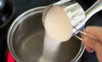 - Om de siroop te koken, giet je kristalsuiker in een pan en vul je het met water - stuur het naar het fornuis en kook tot het dikker wordt, onder voortdurend roeren.