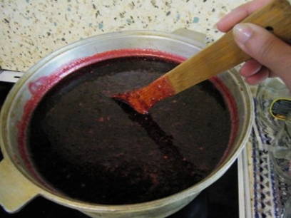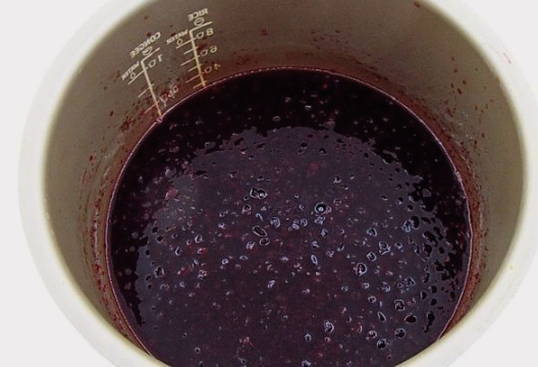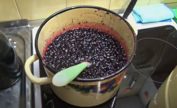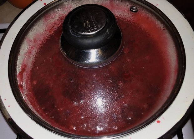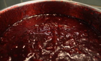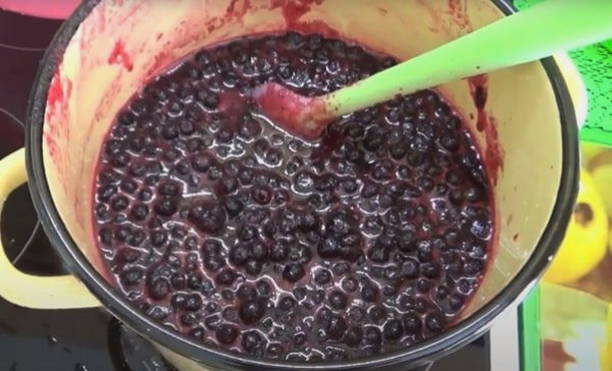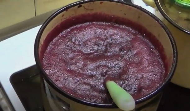 - We brengen de bosbessenmassa over in een pan of kookpan, brengen aan de kook (onder voortdurend roeren) en koken dan nog ongeveer 5 minuten op middelhoog vuur onder een deksel.