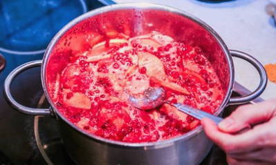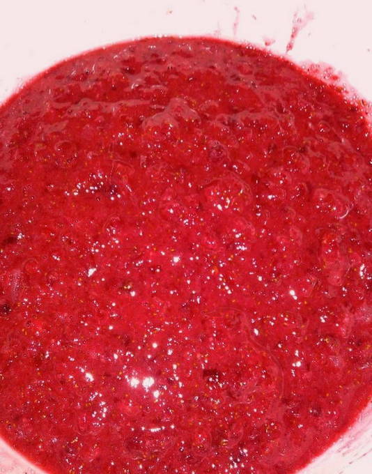 - Voeg na afloop van de tijd fruit- en bessenpuree toe aan de zoete siroop en laat nog 15 minuten sudderen.