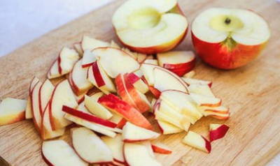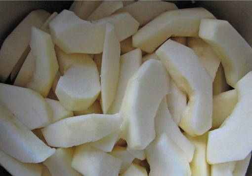 - Schil een kilo appels van de schil en het zaaddoosje en snijd het sappige vruchtvlees in plakken van gemiddelde dikte.