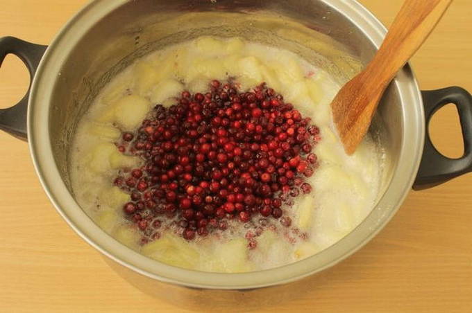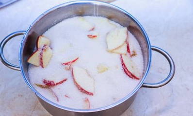 - Voeg appelschijfjes toe aan de bessen, bedek met kristalsuiker en stuur naar het fornuis, kook op laag vuur.