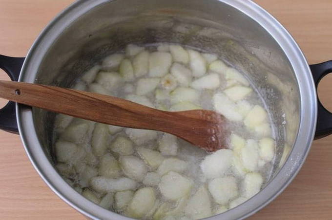 - Om de siroop te koken, giet je een beetje water in een pan, voeg je kristalsuiker en een in kleine stukjes gesneden peer toe - laat op laag vuur ongeveer 15 minuten sudderen na het koken (de suiker moet in siroop veranderen).