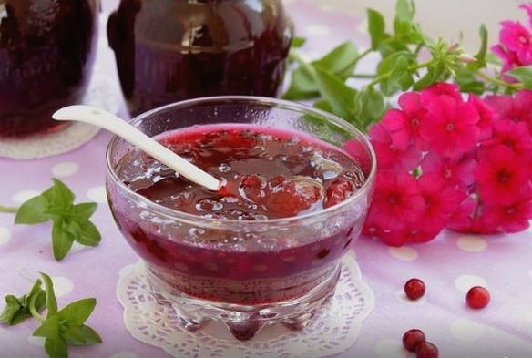 Rode bosbes en bosbes - vormen een ongelooflijke combinatie van zoetzure smaken die velen zullen aanspreken. Deze lekkernij is perfect voor het vullen van biscuitcakes en taarten en bevat ook veel vitamines.