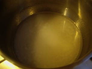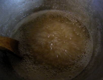 Suikersiroop koken. Giet hiervoor anderhalve glazen gezuiverd drinkwater en een kilo kristalsuiker in een pan - kook onder voortdurend roeren op middelhoog vuur.