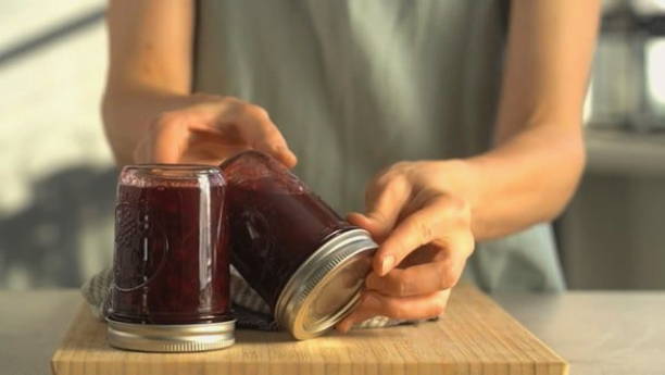 Giet de afgewerkte jam in droge en steriele potten en rol deze onmiddellijk op met een speciale machine.