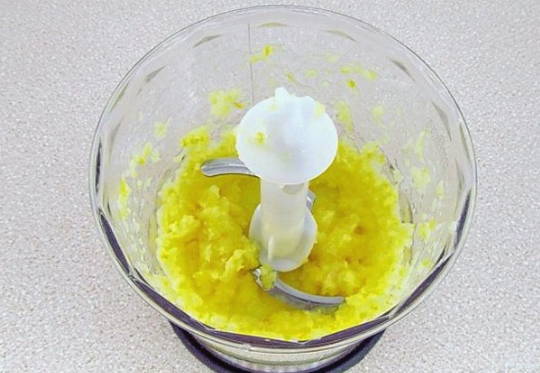 - Snijd ½ deel van de citroen direct in de schil in kleine stukjes en onderbreek in een blender tot een puree-consistentie.