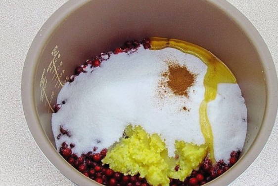 - Doe vossenbessen, honing, kaneel, gehakte citroen in de kom van de multikoker.