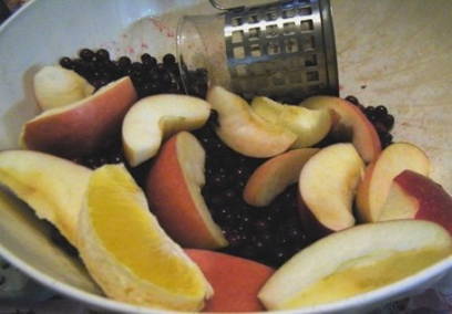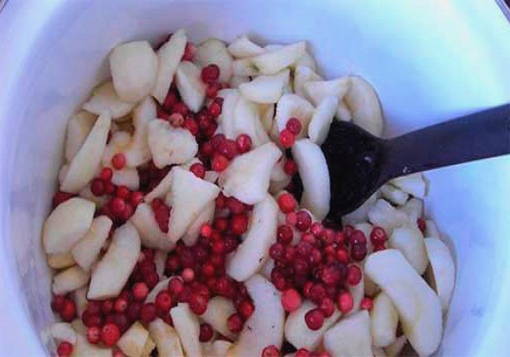 - Meng in een diepe bak de gewassen bessen, in stukjes gesneden appels (zonder schil) en sinaasappels, uit elkaar gehaald in plakjes.