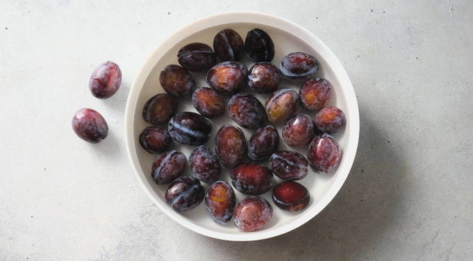 - Sorteer de pruimen, verwijder de beschadigde bessen en spoel ze goed af met stromend water.