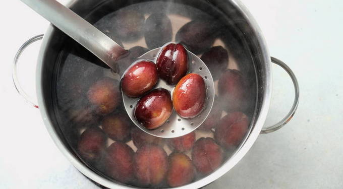- Leg de pruimen in heet water en laat ze 3-5 minuten staan, giet dan het water af. Leg de pruimen direct in ijswater. Droog de bessen vervolgens af met keukenpapier.
