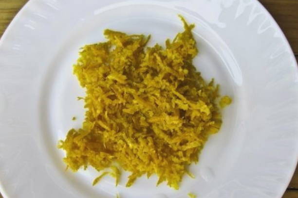 - Rasp de sinaasappelschil op een fijne rasp.