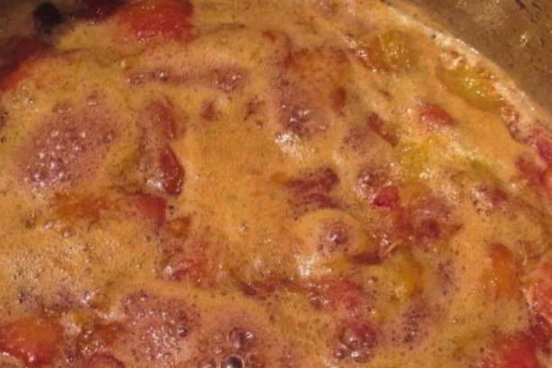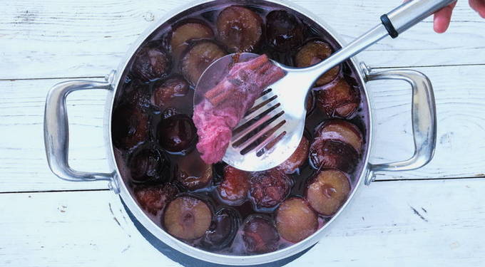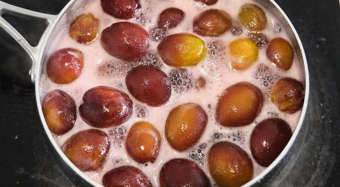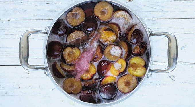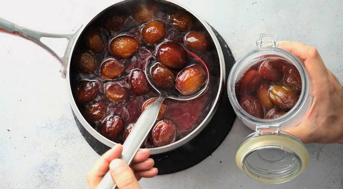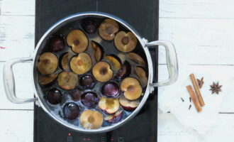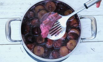 - Dompel de pruimen vervolgens in de kokende siroop, roer en verwarm ze een minuut. Haal de pan van het vuur en laat de jam 3 uur staan.