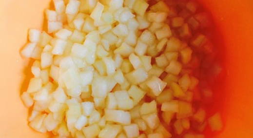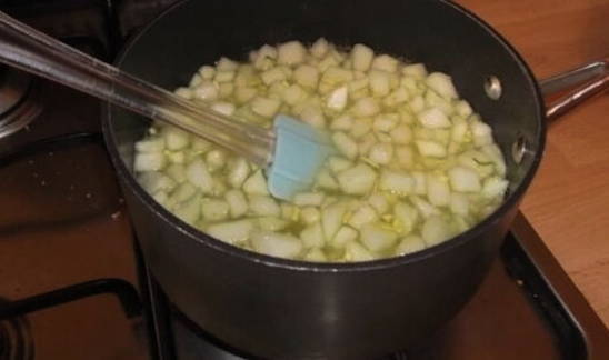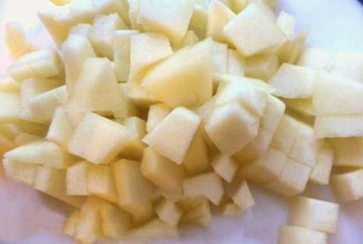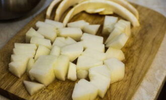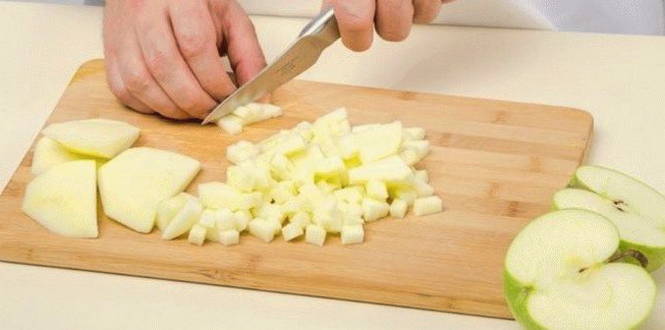 - En meteen door naar de appels. We schillen en schillen de vruchten en snijden ze in kleine stukjes van elke vorm.