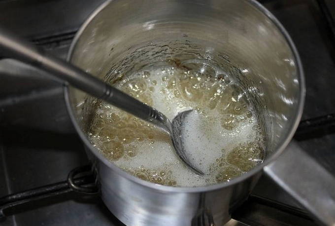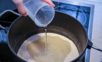 - Laten we beginnen met de bereiding van de suikersiroop. Los de kristalsuiker op in een kleine hoeveelheid water en breng de vloeistof aan de kook.