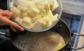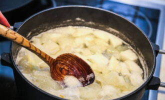 Doe de meloen vervolgens in kokende suikersiroop en kook op laag vuur gedurende 25-30 minuten, af en toe roeren en het resulterende schuim van het oppervlak verwijderen.