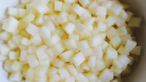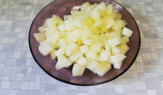 - Verwijder de korst van de meloen en hak het vruchtvlees willekeurig fijn.