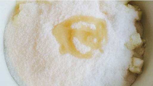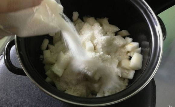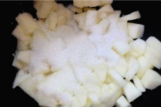 - Voeg suiker toe aan de geplette meloen en laat minimaal vier uur trekken.
