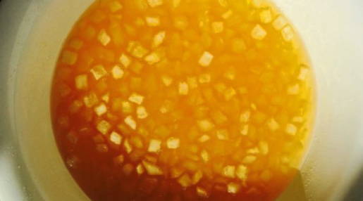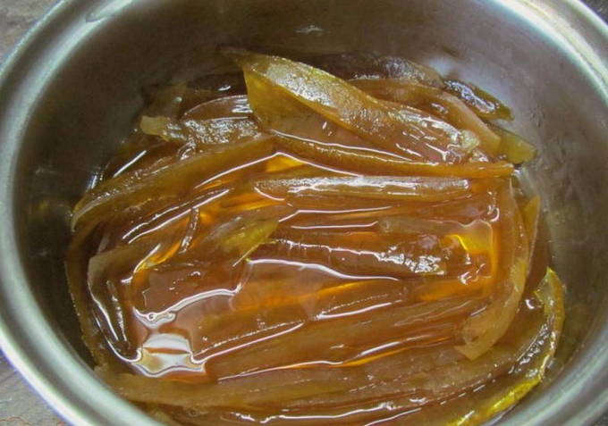 - Als de bereiding van de meloen bijna klaar is, snijd je de sinaasappel in schijfjes en voeg je deze toe aan de meloen tot het vruchtvlees dikker wordt en transparant wordt.