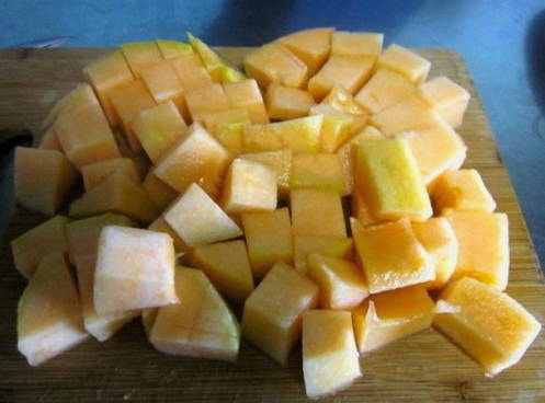 - We maken de meloen schoon van zaden en schillen en snijden hem vervolgens in kleine blokjes.