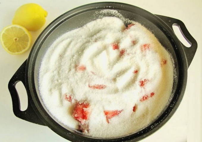 - Na deze tijd extraheren we de meloen met watermeloen en sturen deze naar een klein vuur. Giet er citroensap bij en roer goed door. We koken op deze manier een uur, af en toe roeren en het schuim van het oppervlak verwijderen.