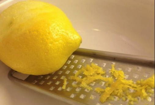 - Verwijder de schil van de citroen met een fijne rasp, na goed afspoelen en drogen.