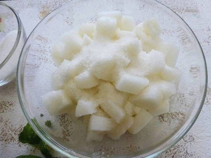 - Scheid het meloenvlees van de schil, snijd het in blokjes en bedek ze met suiker. Laat de meloen ongeveer 30 minuten staan zodat hij zijn sap begint te maken.