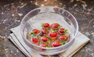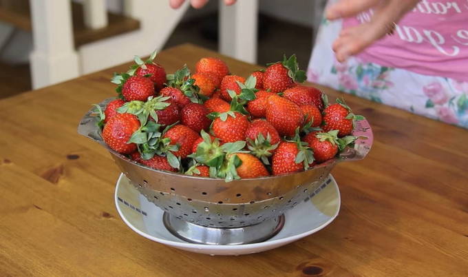 We bereiden rijpe aardbeien, vullen met water, waarin we de aardbeien een paar minuten laten staan, zodat het zand wegtrekt en pas dan snijden we de groene staarten af.