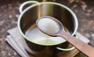 Voor siroop, combineer kristalsuiker met water en breng het mengsel aan de kook, denk eraan constant te roeren.