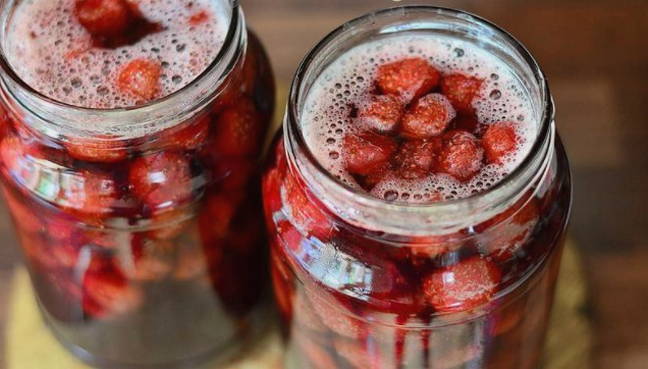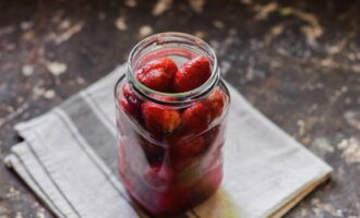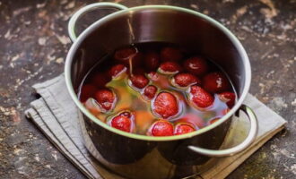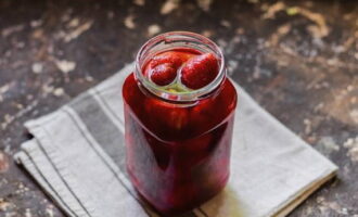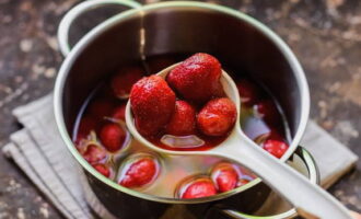 Doe de voorbereide en schone aardbeien in een pan, giet onmiddellijk hete suikersiroop en laat afkoelen op kamertemperatuur.