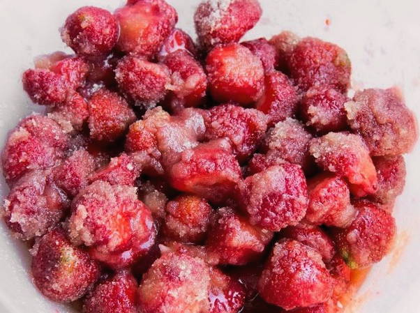 - Vul vervolgens de gepelde bessen met kristalsuiker, goed roeren. In deze vorm sturen we de container met aardbeien de hele nacht naar de koelkast.