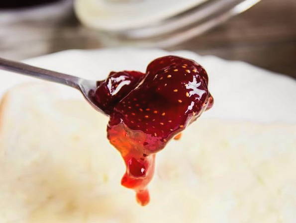 Quick Strawberry Pectin Jam heeft een gemiddelde dikte, maar de meest uitgesproken aardbeiensmaak door de kleinere hoeveelheid kristalsuiker in de jam.