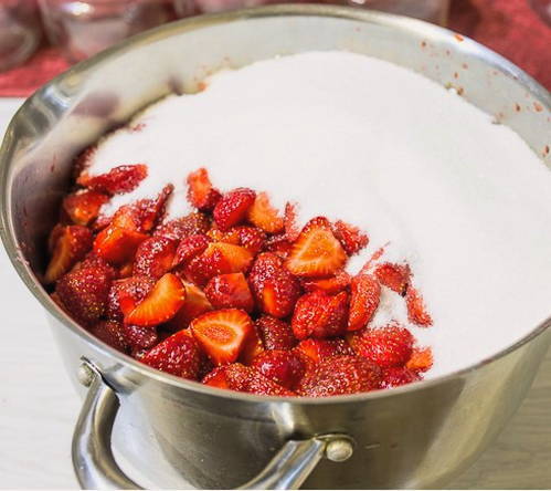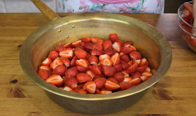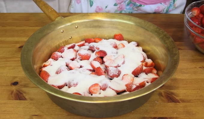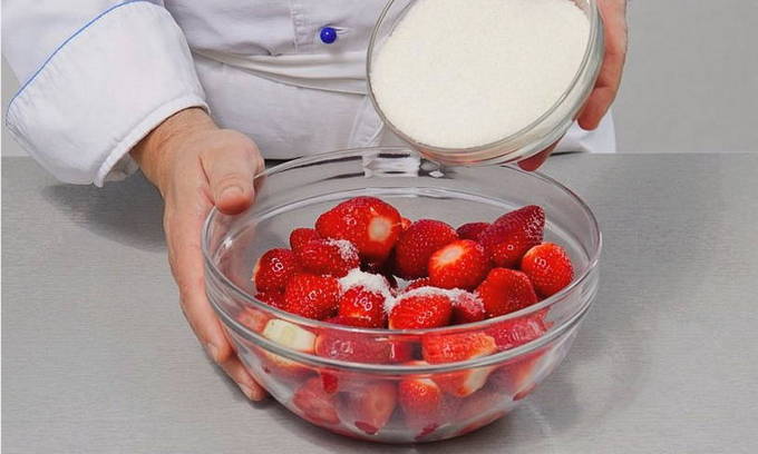 - We brengen pure aardbeien over in een pan en bedekken met kristalsuiker. Meng de aardbeien voorzichtig met de suiker, zorg ervoor dat je de bessen niet beschadigt en intact blijft.