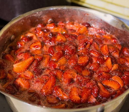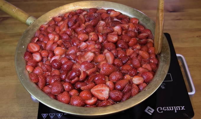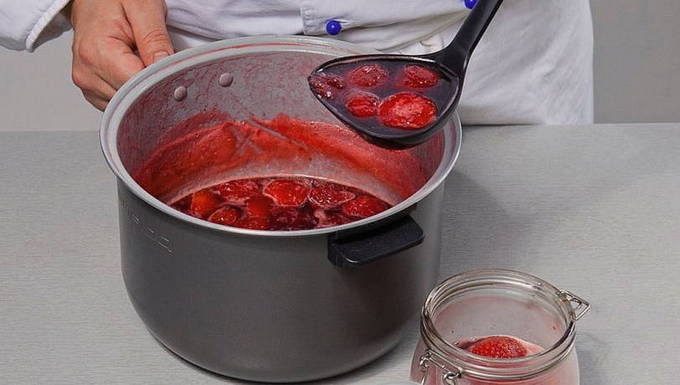 - Verwarm een pan met gekonfijte aardbeien op laag vuur en breng aan de kook. Dit duurt ongeveer 20 minuten, daarna voegen we de gezwollen gelatine toe aan de gekookte aardbeien en laten we de jam nog 20 minuten koken.