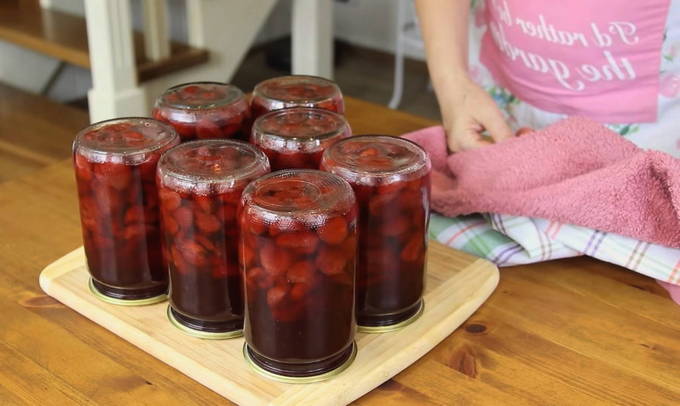- Doe de bereide jam warm in de voorbereide potten, sluit de deksels en draai hem ondersteboven. Dek ze in deze positie af met een handdoek en laat ze een paar uur afkoelen.