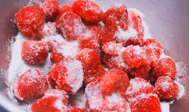 - Giet hier kristalsuiker en, zonder de ingrediënten te mengen, aandringen op de aardbeien.