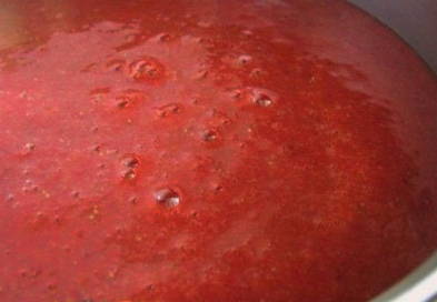 - Giet het mengsel uit de blenderkom in een geëmailleerde pan waarin we de jam gaan koken.