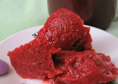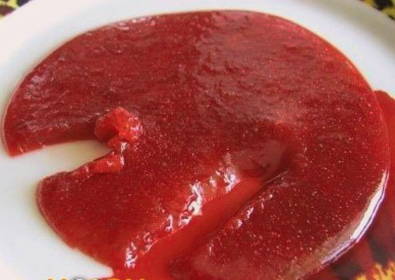 - Na 30 minuten sturen we de gekonfijte gehakte bessen om op te warmen op laag vuur. Doe een paar eetlepels warme bessen in een kom met agar-agar en maal de componenten goed door elkaar.
