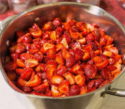 - De potten waarin we de jam gaan rollen, worden vooraf gewassen en gedroogd.Pas dan vullen met aardbeienjam, goed sluiten en vastbinden met een lint.