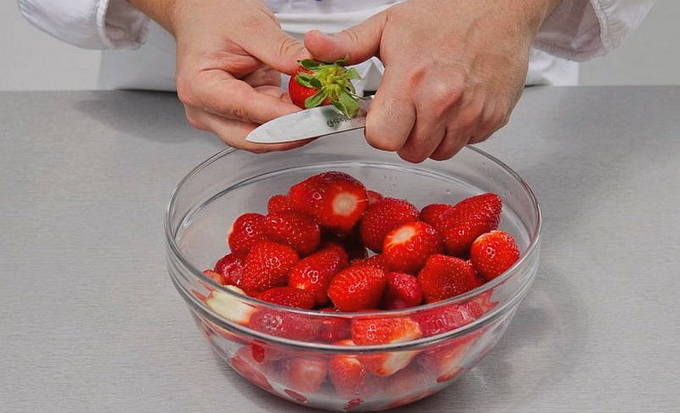- We beginnen het kookproces met de bereiding van de bessen. In eerste instantie verwijderen we de stelen, spoelen de aardbeien in een bak met water en snijden de bessen pas in verschillende stukken, afhankelijk van de grootte.