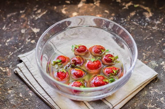 We bereiden rijpe aardbeien, vullen met water, waarin we de aardbeien een paar minuten laten staan, zodat het zand wegtrekt en pas dan snijden we de groene staarten af.