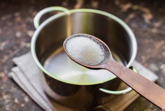 Voor siroop, combineer kristalsuiker met water en breng het mengsel aan de kook, denk eraan constant te roeren.