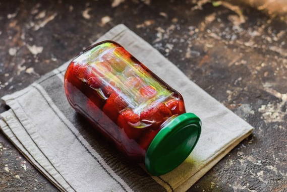 Doe de voorbereide en schone aardbeien in een pan, giet onmiddellijk hete suikersiroop en laat afkoelen op kamertemperatuur.