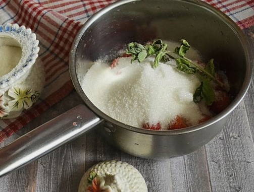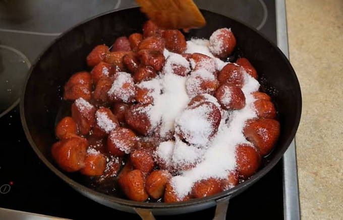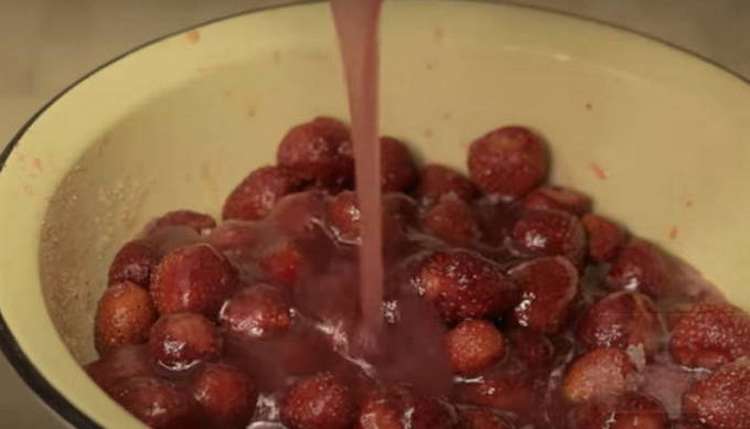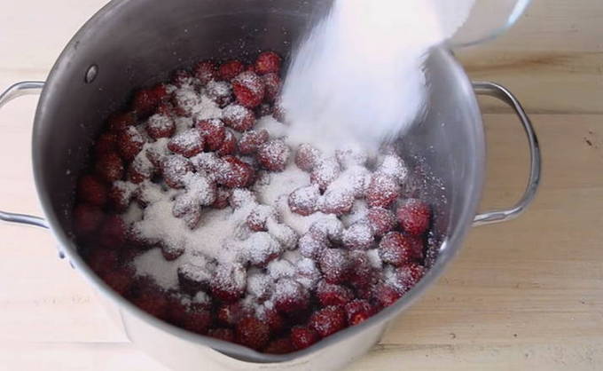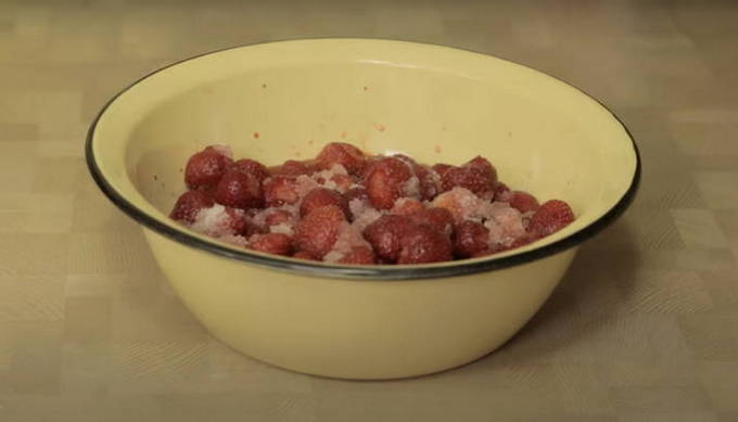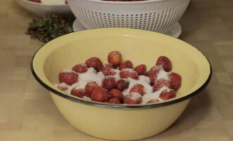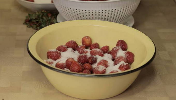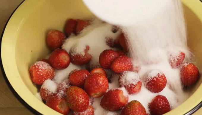 - Bedek de aardbeien vervolgens met suiker en laat 2-3 uur staan zodat de bessen het sap kunnen vrijgeven. Tijdens het proces kunt u de gerechten periodiek schudden met aardbeien. U hoeft in dit stadium niet te roeren.