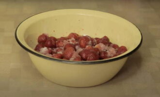 - Bestrooi de bessen vervolgens met suiker en zet 2-3 uur in zodat de suiker in het aardbeiensap is gedrenkt. Als de tijd het toelaat, kunt u het een nacht laten weken.