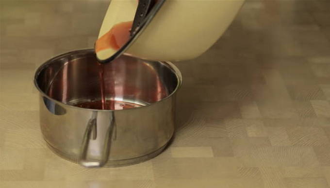 - Giet vervolgens alle siroop terug in de pot. Sluit het deksel en schud goed voordat u de siroop uit de pot giet. Schenk vervolgens de siroop uit het geopende deksel.