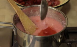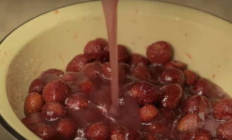 - Giet de aardbeien in de pan. Breng het aan de kook en begin 5 minuten te bakken. Tegelijkertijd moeten de aardbeien sap afgeven. Roer voorzichtig.