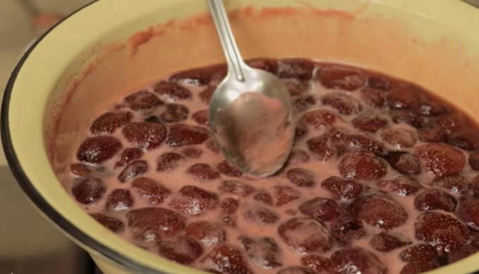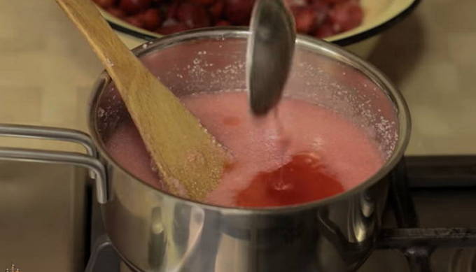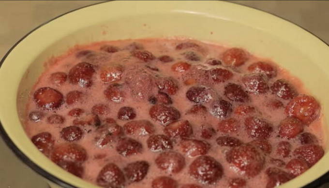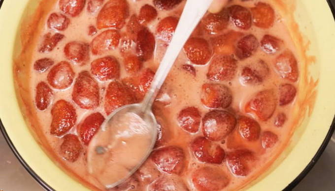 - Zet de schaal met aardbeien op het vuur en breng aan de kook. Vergeet niet het schuim op te vangen.